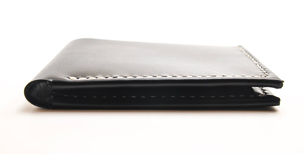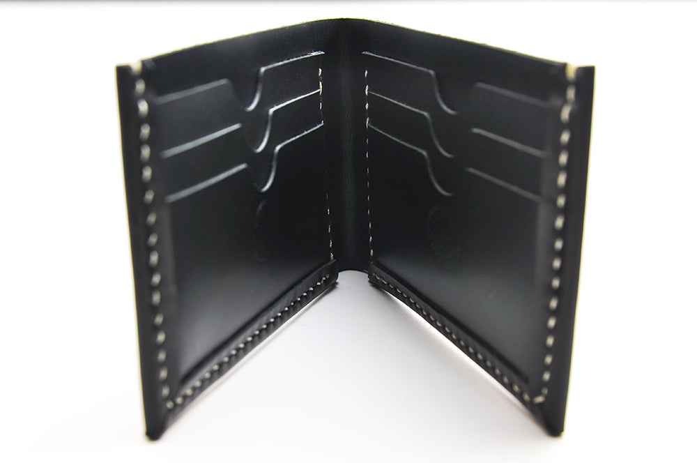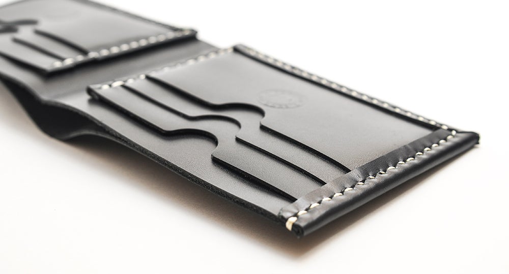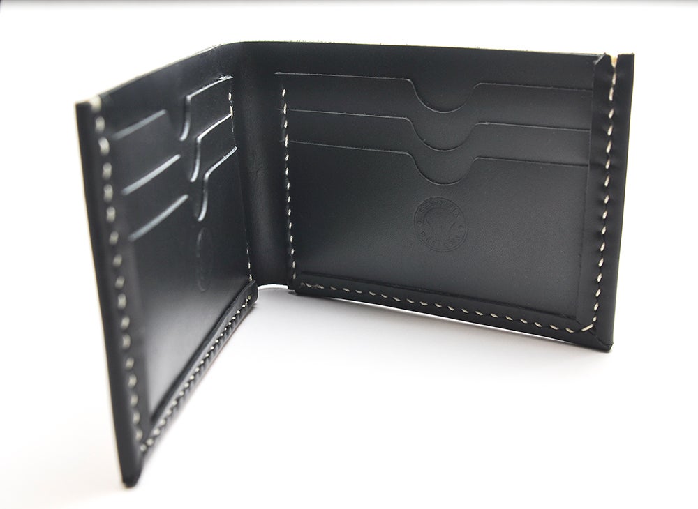 Custom made leather bifold wallet, made from a limited supply of our supple black designer leather.